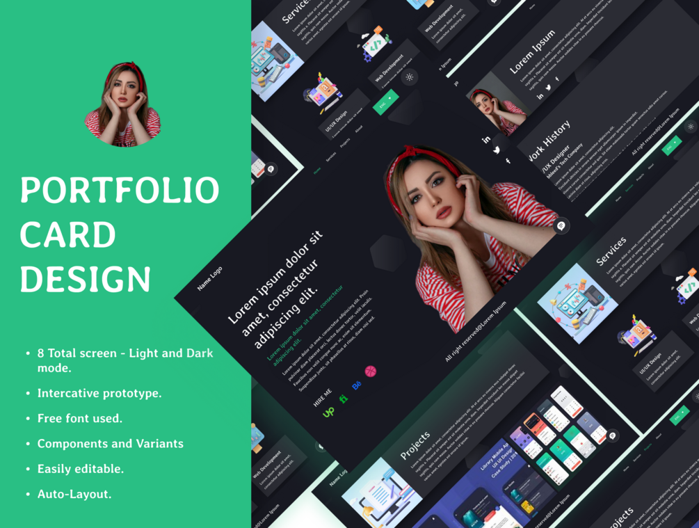 Portfolio is a card-based resume web design with a total of 26 screens (Dark & Light). It has an interactive prototype that you can play around with and more.